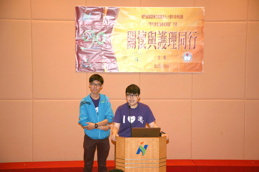 月會二:關懷與護理同行 (2012/11/09) 學院以護理的理論與實踐學習為日常教學內容,透過學習體現從人到仁的精神,而關懷和護理就是當中的重要元素。在 2012 年 11 月 9 日,兩屬會就以微電影問答遊戲和分享的型式,向師生以及學長學姐們展示他們的所學所長。從觀察所得,他們已經能掌握一定的知識,但難能可貴的,是他們從學習中得到的領悟。除了由他們的急救知識演示外,大家能體會學習和成長的,是他們實實在在的個人分享。在長康會和急救隊代表的分享當中,大家能感受到的,是他們從學習和服務當中,反思到個人生路歷程,以致學習護理的核心價值,在笑與淚當中日漸成長,走向以護理生涯的道路。