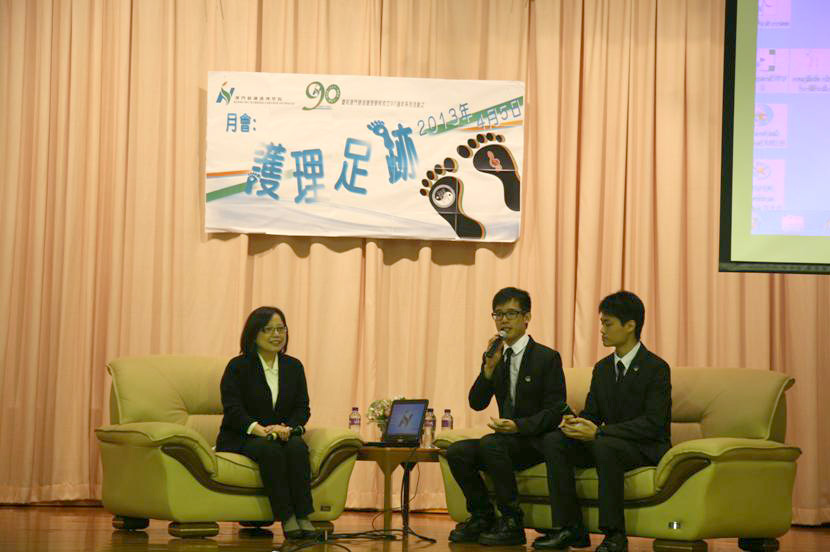 月會五:護理足跡 (2013/04/05 ) 一個以論點實證為本,一個以歌聲打動人心,理性與感性,本來就是不相合的組合,碰在一起會有何化學反應?所有的答案皆可由是次月會為大家解答。 作為最後月會系列壓軸活動,兩屬會也誠邀了重量級的嘉賓為大家分享,她就是尹一橋院長。 尹院長作為護士數十載,既能夠以身作則做好工作事,更能平衡個人成長、家庭、以政服務社會等,她於月會內一一為同學們作詳細分享。在分享過程中,她帶給了同學很多正面、美好的訊息,包括作為護士時候的喜樂、以及作為老師時的趣事,同時,她亦分享了自己經歷過的辛酸、曾經令自己百感交集的片段。最重要的是她展示了成長必有甜苦,只要對自己夢想堅持,就可走出光輝的道路,透過實實在在的經驗分享,也正展示了她能一步步走出護士之路,全因她從未忘記箇中的真蹄及作為護士的本質。 同場聲夢合唱團也高歌了三首歌,包括校歌、 Fly up to the moon 和歲月如歌,憑歌寄意,剖白母校生活點滴,一路走到將來實現夢想為人生目標,而最後一節的月會,亦在動人的旋律中完滿結束。 以不同形式,帶出學院從人到仁的理念,精彩的月會系列,將長存在大家的腦海中。