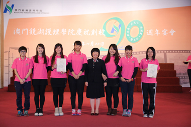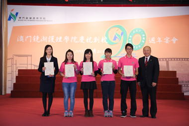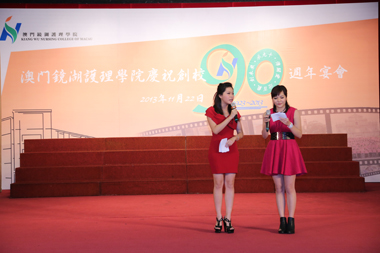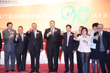本院為慶祝創校九十週年,於十一月二十二日一連舉辦了校友座談會及聯歡餐會等誌慶活動;由學院與學生會及校友會合作舉辦校慶系列活動於二0一二年啟動,至今一年多內,師生校友共同回顧歷史,展望未來。 「資深校友話當年」及「校友座談會」於當日上午假學院多功能室及演講廳舉行,晚上七時半假萬豪軒酒家舉行「澳門鏡湖護理學院慶祝創校九十週年宴會」,澳門特別行政區行政長官崔世安,全國政協副主席、鏡湖慈善會永遠主席何厚鏵,中央人民政府駐澳門特別行政區聯絡辦公室副主任陳斯喜,澳門特別行政區社會文化司司長張裕,澳門基金會行政委員會主席吳志良,澳門特別行政區政府衛生局局長李展潤,澳門特別行政區政府高等教育輔助辦公室主任蘇朝暉,鏡湖慈善會副主席、澳門鏡湖護理學院校董會榮譽副主席許世元,鏡湖慈善會理事長、澳門鏡湖護理學院校董會主席馮志強,中華護理學會理事長李秀華,澳門鏡湖護理學院院長尹一橋,澳門鏡湖護理學院暨鏡湖護士助產學校校友會會長梁寶卿,澳門鏡湖護理學院學生會主席林詩慧等共同擔任主禮嘉賓。 馮志強指出,本院九十年來秉承著南丁格爾無私奉獻精神,大力倡導“從人到仁”的教育理念,共培育了近二千二百多名合格護士,其中近六百名為學士學位畢業生,部分成為醫療機構或社會服務機構的護理中堅力量,他們的熱誠愛心、關懷奉獻、勤奮務實的高尚職業道德贏得了社會的讚譽,使本院成為了南丁格爾的搖籃。為使學院可持續發展和配合特區政府的施政,已於二0一0年制訂了新校區暨十年發展計劃綱要,目前在課程層次和學生素質等方面均有所提升,各項工作正朝著未來的目標穩步推進,取得了階段性的成績。展望未來,馮志強表示護理工作模式已轉變為以注重人文關懷為核心的責任制整體護理,更加注重運用專業技術知識,提供全人照護,校董會支持本院繼續發揚南丁格爾精神,為本澳的護理事業不斷發展作出努力。他最後代表慈善會及校董會對歷年支持襄助學院的特區政府,熱心團體和社會各界人士,以及長期為護理教育事業默默耕耘、無私奉獻的教職員工致謝。 是日宴會延開八十多席,本澳、內地、香港等地護理界、高校、社團代表、校友、師生等出席,場面熱鬧。會上,主禮嘉賓主持了開香檳、切蛋糕和祝酒儀式,為學院踏入九十一週年揭開序幕。席間頒發為校爭光獎及攝影、微電影比賽獎項。校友周佩英、何浩斐擔任壓軸嘉賓,聯同在讀學生樂隊演唱助慶,學生會屬會聲夢合唱團及教師員工攜手演唱,氣氛熱烈。